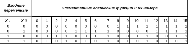 Для n = 2 число различных переключательных функций равно 16. Эти функции называются элементарными и составляют максимальный набор элементарных логических функций. Все они представлены в таблице 1.3, в левой части которой приведены все четыре набора аргументов, а в правой 16 различных значений элементарных логических функций.