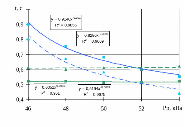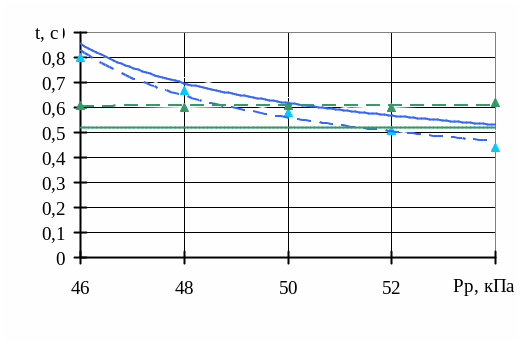 Рисунок 4.11. Порівняння залежності тривалості протікання тактів t1 і t2 від робочого вакуумметричного тиску в керуючій частині ГІТ