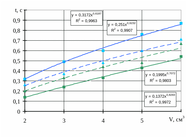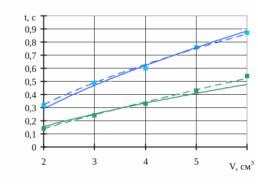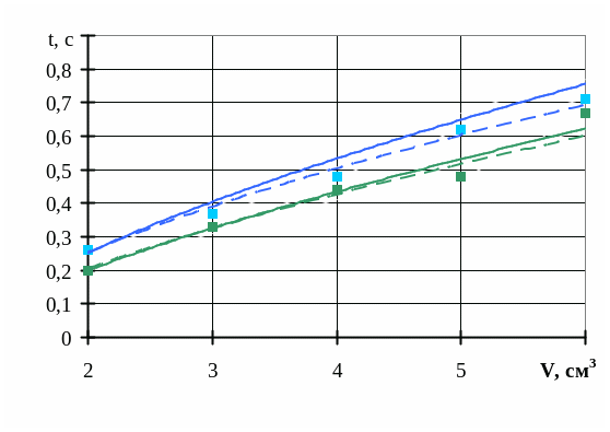 . Рисунок 4.6. Експериментальна залежність тривалості протікання тактів t1 і t2 від об’єму керуючої камери