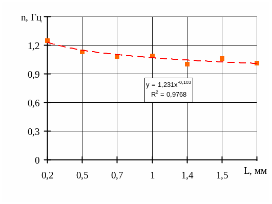 Рисунок 4.9. Експериментальна залежність частоти пульсації від осьового переміщення клапана