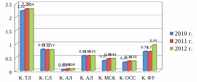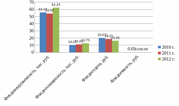 Поскольку производственная площадь организации также оставалась неизменной (293 м2), а среднегодовая стоимость основных производственных фондов организации возрастала, то показатель фондооснащенности вырос за 2010-2012 гг. на 24,13%.