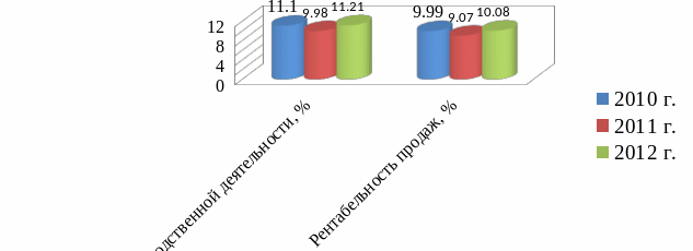 Рисунок 2.4 – Динамика показателей рентабельности производственной деятельности и рентабельности продаж ООО «Витязь» за 2010-2012 гг., %