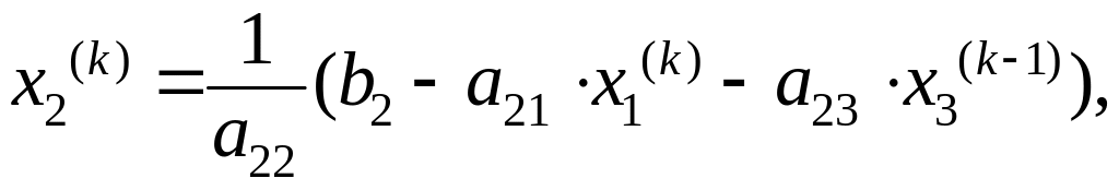 На этом заканчивается первая итерация решения системы (4.12), (4.13), (4.14). Используя теперь значения x1(1), x2(1), x3(1), можно таким же способом провести вторую итерацию. В результате нее будут найдены вторые приближения к решению: x1 = x1(2), x2 = x2(2), x3 = x3(2). Затем выполняется третья и последующие итерации. Приближение с номером k можно представить в виде: