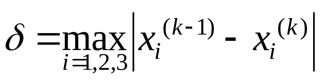 Итерационный процесс продолжается до тех пор, пока значения x1(k), x2(k), x3(k) не станут близкими с заданной погрешностью к значениям x1(k-1), x2(k-1), x3(k-1) . Т.е. вычисляется параметр