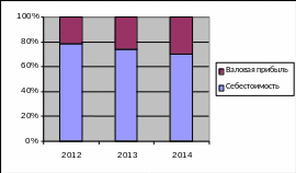 Максимальную долю в выручке занимает себестоимость, ее доля снизилась за три года на 8,22%. На долю валовой прибыли в 2012 году приходится 70,52%, ее доля за два года увеличилась на 3,46%, а за три года на 8,22% (рис.6).