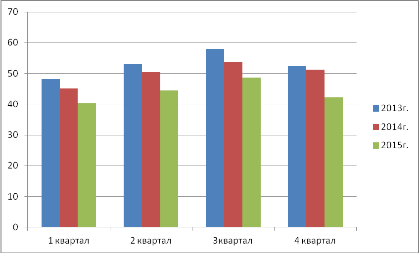 Анализируя объем реализации продукции по кварталам (Таблица 10), Рисунок 8), можно сделать вывод, что снижение происходит в 1 и 4 кварталах. Однако в целом за 2013-2015гг. общая реализация товаров значительно снизилась, что говорит об отрицательной тенденции в области реализации, то есть в УФПС Владимирской области регулярно падает объем продаж товаров.