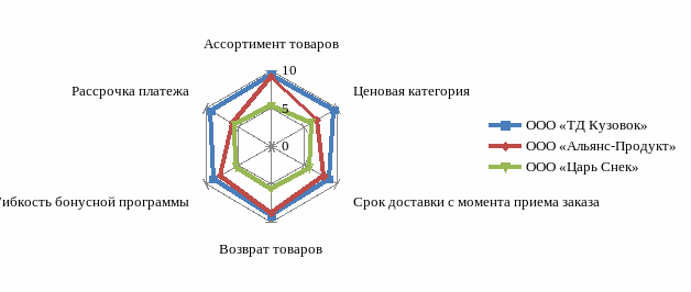 Построение радара конкурентоспособности свидетельствует, что сила конкурентоспособности у ООО «ТД Кузовок» достаточно высокая и преобладает над другими конкурентами. Однако имеются и области, над которым необходимо работать в целях повышения конкурентоспособности, а именно:
