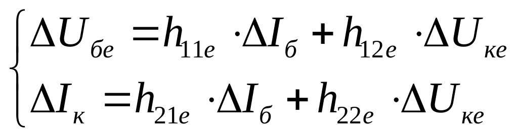 Взаємозв’язок між вхідними та вихідними напругами і струмами чотири-полюсника відображається через систему двох рівнянь, які складаються за допомогою вторинних (зовнішніх) параметрів транзистора. Найбільш пошире-ною є змішана система або так звана система h-параметрів. h-параметри транзистора, включеного по схемі СЕ, визначаються за такими формулами та мають наступний фізичний зміст: