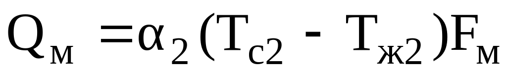 Коэффициент эффективности ребер всегда меньше единицы. Чем резче меняется температура вдоль ребра, тем меньше коэффициент эффективности. Для коротких ребер, выполненных из высокотеплопроводных материалов, коэффициент эффективности близок к единице. Определим тепловой поток через плоскую стенку, площадь гладкой поверхности которой F1, а площадь ребристой поверхности – F2. Площадь F2 складывается из площади боковой поверхности ребер Fp и площади межреберных участков Fм. При стационарном режиме поток тепла от горячей среды к стенке, через стенку и от стенки к холодной среде выразится формулами