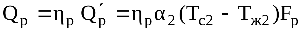 Наличие ребер на стенке увеличивает поверхность ее соприкосновения с теплоносителем и тем самым уменьшает термическое сопротивление теплопередаче. Поэтому наличие ребер может использоваться как средство интенсификации процесса теплопередачи или как средство снижения температуры стенки. Пусть на рис. 3.2 поверхность стенки со стороны жидкости с температурой Тж2 имеет в наличии ребра. При Тж1Тж2 температура ребра, равная у его основания температуре поверхности между ребрами Тс2, будет уменьшаться к его концу. Температуру среды Тж2 можно считать неизменной для всей поверхности ребра. Поэтому участки поверхности ребра, удаленные от основания, будут отдавать меньше тепла, чем участки, расположенные вблизи основания ребра. Отношение количества тепла, передаваемого поверхностью ребер в окружающую среду Qp, к теплу, которое эта поверхность могла бы передать при постоянной температуре на поверхности ребер, равной температуре у их основания, Qp, называется коэффициентом эффективности ребер