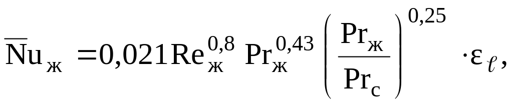 Это уравнение справедливо для любой формы канала, в том числе для кольцевого (d2/d1=15,6) и щелевого (а/в=140). За определяющую температуру здесь взята средняя температура жидкости, о чем информирует индекс «ж». Индекс «с» в формуле говорит о том, что данный критерий рассчитывается по температуре стенки. Определяющий размер для круглых труб – диаметр, для каналов любого сечения – эквивалентный диаметр dэк=4f/u, где u – периметр канала, f – площадь его поперечного сечения. Поправочный множитель учитывает теплоотдачу на начальном термическом участке трубы и может быть оценен по соотношению