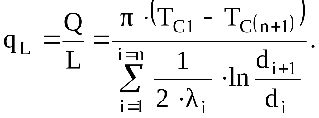 получила название линейного термического сопротивления теплопроводности цилиндрической стенки. Так как общее линейное термическое сопротивление состоит из частных линейных термических сопротивлений, то совершенно очевидно, что для многослойной цилиндрической стенки нужно учитывать линейное термическое сопротивление каждого слоя. Тогда линейная плотность теплового потока через многослойную цилиндрическую стенку, состоящую из n слоев, равна