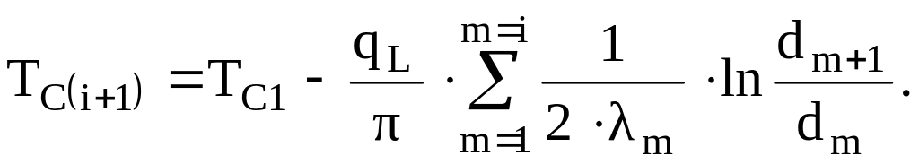 По аналогии с плоской многослойной стенкой температура на границе любых двух цилиндрических слоев i и i+1 может быть определена по уравнению