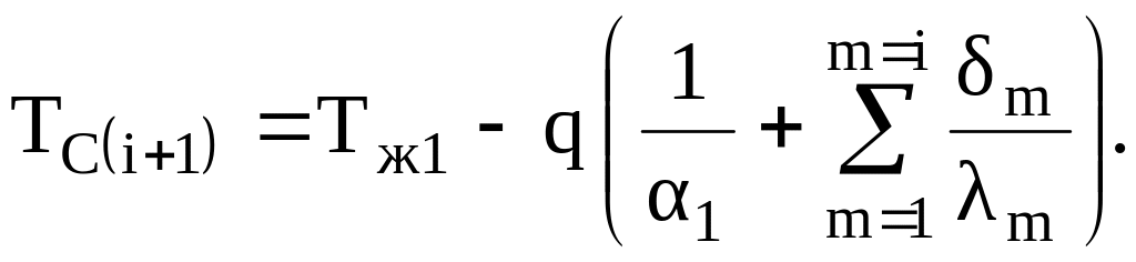 Температура на границе любых двух слоев i и i+1 может быть определена по уравнению