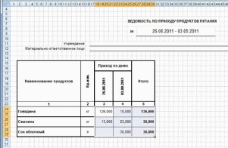 На этом уроке мы реализуем печать данных прихода, расхода и состояния склада. Печать будем реализовывать через MS Excel, то есть это будет не совсем печать, а экспорт данных в MS Excel, а там пользователь может сам выбрать, печатать или сохранить отчет. В начале приготовим шаблоны MS Excel, в которые будем выводить отчеты. Шаблон ведомость по приходу продуктов питания.