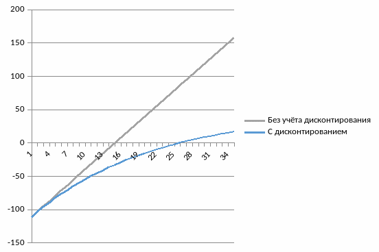 Принимая годовые издержки эксплуатации постоянными (таблица 15.12), а выгоды 111,17 млн.руб./год, а так же экономию рассчитывая как: Вt = Pt - Ct , (млн.руб./год), определим дисконтированный и не дисконтированный графики окупаемости проекта.