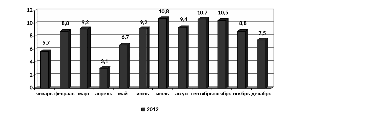 На гистограмме 2 изображен график суммарного количества часов в месяц, при котором скорость ветра не превышает минимально допустимую, за период времени с августа 2008 года по июль 2009 года. Исходя из данных гистограммы, можно с уверенностью сказать, что в году в среднем в течение суток скорость ветра не превышает 2,5 м/с на протяжении 8, 5 часов.
