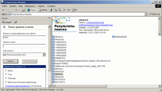 В ОС MS Windows выбираем Пуск —» Найти —» Файлы и папки..., задаем условие поиска (*.doc).