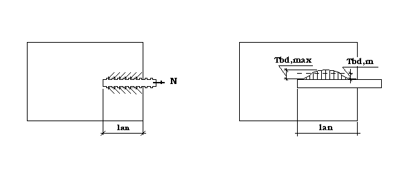 Экспериментально установлено, что напряжения сцепления по длине армат. стержня распределены неравномерно и их максимальная величина не зависит от длины заделки стержня в бетоне (lan), в расчёт вводят средние напряжения сцепления.