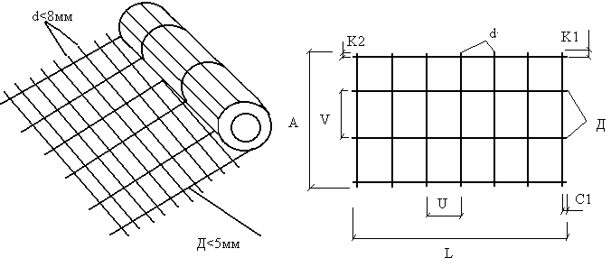 Рулонные сетки имеют ограниченные массой (100-500кг) размеры: ширина не более 3,5м, длина зависит от веса. Рабочая арматура имеет диаметр до 8мм. Используют в качестве арматуры проволоку ВI,BрI d=3-5мм, возможно использование класса А до 8мм.
