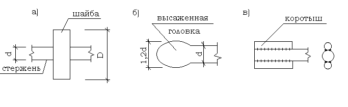 В зонах передачи напряжений устраиваются также анкерные устройства на стержнях: гайки, навинчиваемые на нарезные концы стержня; высаженные на одном из концов головки; цанговые зажимы и коротыши, привариваемые к стержню.