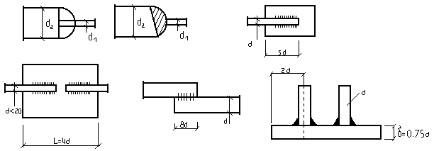 Для соединения арматуры АI- AVI применяют контактную сварку, при этом соотношение d1 и d2 должно быть не менее 0,85.( рис а и б). Если диаметр стержней меньше 20мм, то применяют дуговую сварку с накладками (рис в), выполняя ее 4 или 2-х фланговыми швами. Допускается в отдельных случаях применять нахлесточное соединение стержней арматуры (рис г). Соединение внахлестку арматурных стержней d=8-40мм с пластинкой выполняют дуговой сваркой фланговыми швами (рис д). Соединение стержней арматуры в тавр выполняют автоматической дуговой сваркой под слоем флюса (рис е).