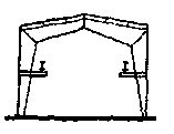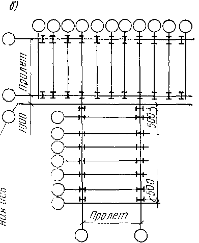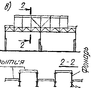 Такое конструктивное решение обеспечивает выполнение эксплуатационных требований в большинстве машиностроительных цехов, в которых оборудование удобно размещается при относительно небольших шагах колонн по внутренним рядам (6—12 м). Технологии производств, размещенных во многих цехах металлургического производства (прокатные цехи, цехи раздевания слитков и т.д.), также позволяют использовать эту схему. Такая схема удобна для бесфонарных зданий и для зданий с продольными фонарями. При необходимости освещения с помощью поперечных фонарей их конструкции также могут быть использованы для опирания панелей покрытия (рис. а, в).