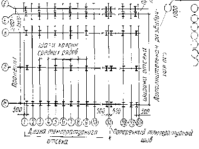 Продольные температурные швы решают либо расчленением многопролетной рамы на две (или более) самостоятельные, что связано с установкой дополнительных колонн, либо с подвижным в поперечном направлении опиранием одного или обоих ригелей на колонну с помощью катков или другого устройства. В первом решении предусматривается дополнительная разбивочная ось на расстоянии 1000 или 1500 мм от основной (рис. а).Иногда в зданиях, имеющих ширину, превышающую предельные размеры для температурных блоков, продольную разрезку не делают, предпочитая некоторое утяжеление рам, необходимое по расчету на температурные воздействия.