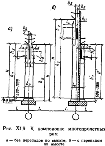 Определение компоновочных размеров для крайних рядов многопролетных рам производится точно так же, как для однопролетных. Если в различных пролетах здания одной высоты краны имеют разную грузоподъемность, то размер h2 (надкрановый габарит (рис. Х1.9) принимают по наибольшему крану. В этом случае при одинаковых отметках верха подкрановых балок будет обеспечен габарит для кранов во всех пролетах.