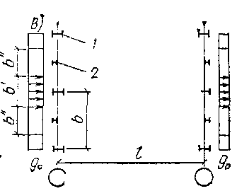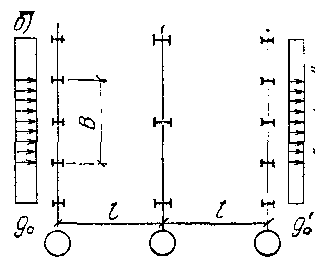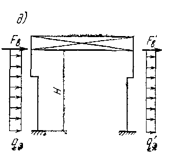 Расчетная схема рамы однопролетного здания при действии ветровой нагрузки показана на рис д. Направление ветра может быть как в одну, так и в другую сторону. В многопролетных зданиях одинаковой высоты активное давление и отсос на наружные стойки определяют точно так же; в зданиях более сложной конфигурации или с продольным фахверком учитываются конкретные условия ветрового воздействия. Например, при наличии стоек продольного фахверка (см. рис в) на раму воздействует линейная нагрузка qB, собираемая с ширины b', а нагрузка с ширины b" передается стойками фахверка частично на фундамент, а частично в виде сосредоточенной силы на рамы в верхних их узлах.