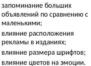 Печатная реклама. Реклама в газетах: формат объявления в 2 стр. + 20% внимания. Если на ½ стр., то снижение до 30%. При близости с рекламным текстом не способствует привлечению внимания. 2 цвета + 50%, 4 цвета + 80%. Эффективно объявление, находящееся внизу или верху стр. При н/в важна иллюстрация, при в/в – текст. Маленькая иллюстрация + 30%, на ½ стр. + 80%. Заголовок решающий для н/в аудитории, для в/в – возбудитель интереса. Размер и местоположение его не влияют на внимание. Для н/в лучше законченный заголовок, для в/в – вступление к тексту. Объемный текст привлекает внимание на 40%. Для н/в 50 слов, для в/в 50-200 слов. Ма-ка/логотип для н/в в заголовке, для в/в под заголовком, внизу или сбоку рекламного текста. Журнальная реклама: наиболее эффективна на обложке журнала черно-белая реклама. Иллюстрация + 70% внимания. Большие несущественно влияют на привлечение внимания аудитории. Избегание абстрактных рисунков. Заголовок при н/в краткий 1-8 слов, расположен над иллюстрацией (подсказка). При в/в 1-5 слов. Мрака/логотип при н/в в заголовок, при в/в не имеет значения, лучше в конец текста. Визуальная реклама. Через глаза поступает 78% всей информации, которую мы воспринимаем из окружающего нас мира. Причем в процессе оптического зрения все эти чувства постоянно включаются в работу, суммируя информацию, необходимую для запоминания и классификации зрительных образов. Мгновенный визуальный образ, живущий лишь доли секунды, формируется на сетчатке глаза в результате воздействия света на фоторецепторы глаза в процессе зрения, и эти мгновенные образы постоянно следуют друг за другом, вытесняя предыдущие. Особенность визуального восприятия заключается в том, что воспринимающая система имеет тенденцию группировать зрительные элементы в простые понятия. Мы подсознательно группируем наши сенсорные данные в готовые объекты, ищем и открываем закономерность в случайном. Широко известны эксперименты с чернильными пятнами, которые прочитывались испытуемыми людьми как силуэты знакомых предметов. Наша зрительная система устроена таким образом, что мы можем увидеть то, что хотим увидеть, а не то, что попадает в поле нашего зрения. Феномен цветового зрения нельзя представить себе в виде простой технической системы, а восприятие цвета обусловлено не только стимуляцией глаза определенной длиной волны и величиной интенсивности света. Восприятие - это не механическое регистрирование элементов, а схватывание и постижение значимых структурных свойств объекта. Каждый акт восприятия представляет собой визуальное суждение. Константность – тарелка под углом зрение кажется овальной.