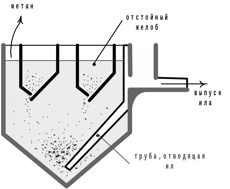 Сбраживание осадка идет по иному типу, без зловония и с образованием более благоприятных конечных продуктов. Вначале распад осадка происходит под влиянием микробов, живущих при кислой реакции среды. Эта стадия называется «кислое брожение». Затем на известной стадии процесса меняется реакция среды (рН 7–8) и начинают действовать иные микробы, проявляющие жизнедеятельность в щелочной среде («метановое брожение»). Пущенный в эксплуатацию двухъярусный отстойник сначала имеет кислое брожение осадка. Затем со дна иловой камеры начинает развиваться метановое брожение. Чтобы не нарушить метанового брожения, выпуск свежего ила производят не сразу, а небольшими порциями каждые десять дней. При одновременном выпуске всего ила в массе свежей сточной воды снова развивалось бы кислое брожение с его отрицательными свойствами. Сброженный осадок приобретает черный цвет, легко отдает влагу, лишен неприятного запаха, в значительной степени освобожден от патогенной микрофлоры и яиц гельминтов.