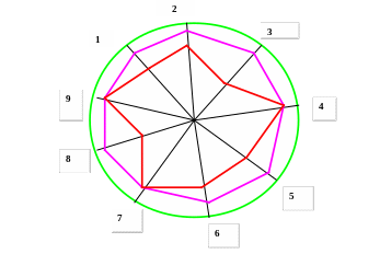 По радиусам круга указаны точки, соответствующие обобщенным ( в результате свертки) характеристикам деятельности организации по каждому виду менеджмента. Многоугольник сиреневого цвета соответствует оптимальным значениям характеристик, а многоугольник красного цвета – реальным значениям.