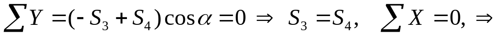 Если в узле сходятся четыре стержня попарно лежащие на двух прямых и никакой нагрузки в узле нет, то в стержнях расположенных на одной прямой усилия одинаковы.