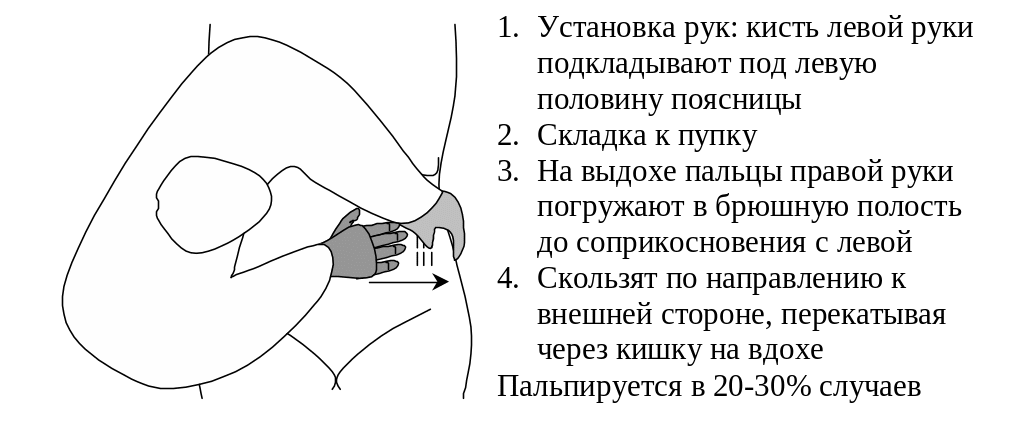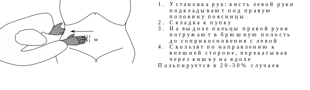 пальпируется в правой подвздошной области. Линию между передним верхним бугорком подвздошной кости и пупком мысленно делим на 3 части, линию пальцев ставим косо на границе между наружной и средней третью. Проделываем все 4 этапа пальпации, даем характеристику слепой кишки.