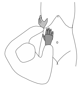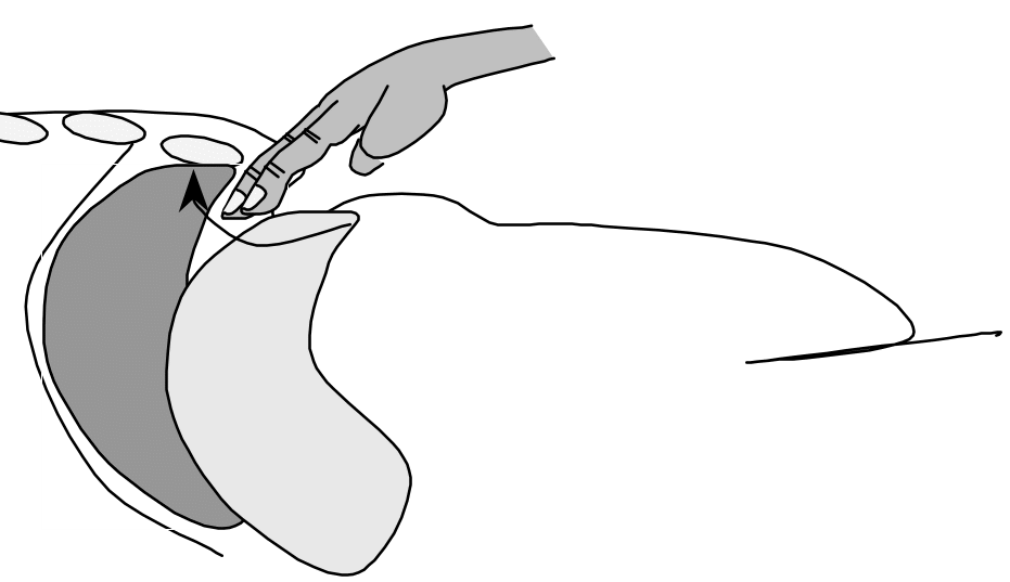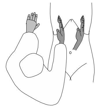 1) установка рук: левая фиксирует реберную дугу, правая - параллельно реберной дуге;