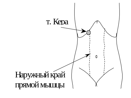 Местом проекции желчного пузыря является точка Кера, расположенная на пересечении нижнего края печени и края прямой мышцы живота (рис52).