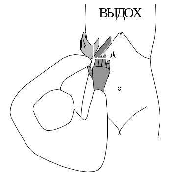 5) затем на выдохе, край печени вновь проходит под пальцами врача и в этот момент опять доступен пальпации (пальпация на выдохе). |
