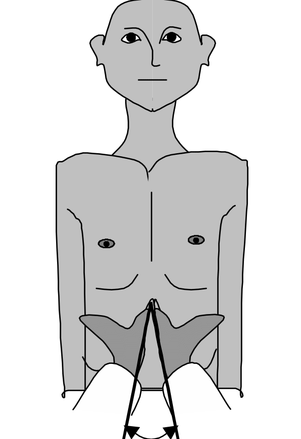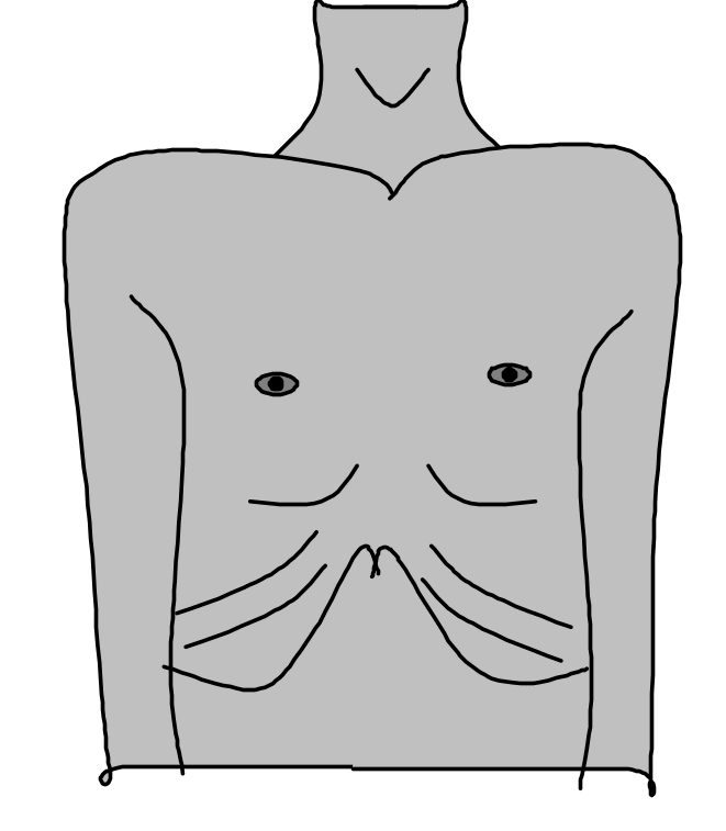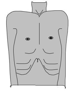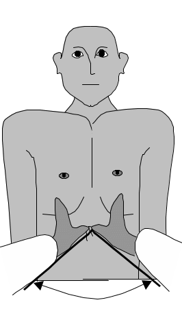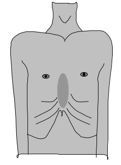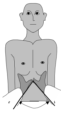 на над- и подключичные ямки, симметричность, западение, выпячивание; выраженность угла соединения тела с рукояткой грудины (угол Людовика); надчревный угол (эпигастральный),