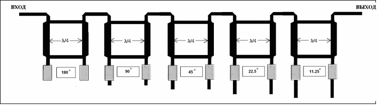 т. е. фазовый сдвиг одноступенчатого проходного ФВ на гибридных устройствах равен фазовому сдвигу, создаваемому входящим в его состав отражательных ФВ. Пример топологии двухразрядного ФВ на четыре фазовых состояния приведён на рис. 7.