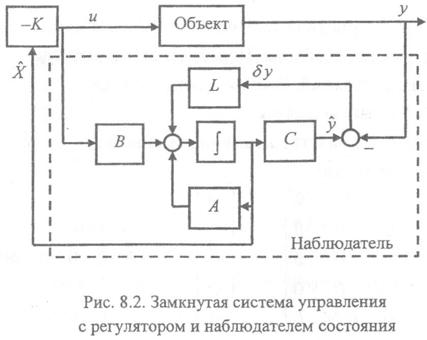 Собственные значения, заданные при синтезе наблюдателя состояния, должны обеспечивать большее быстродействие, чем собственные значения, заданные при синтезе регулятора. На рис. 8.2 представлена структурная схема замкнутой системы с регулятором и наблюдателем состояния.