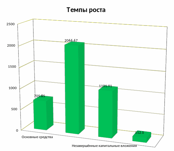 Анализ показал, что общая сумма вне оборотных активов увеличилась почти в семь с половиной раз (2156370/305500) и составила 1850870 млн. руб. В структуре вне оборотных активов произошли лишь незначительные изменения. Так доля основных средств уменьшилась на 4,37 процентных пункта, и на ровно такую же величину выросла доля незавершённых капитальных вложений, что является положительным фактом. Высокие темпы роста по итогам года показали нематериальные активы. Они увеличились более чем в 20 раз. Этот факт объясняется покупкой в 2012 году лицензионного программного обеспечения для автоматизации работы бухгалтерии.