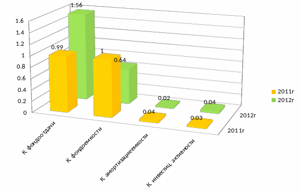 Из таблицы 4 следует что, за анализируемый период значение коэффициента фондоотдачи увеличилось с 0,99 до 1,56. Так как стоимость основных средств за отчетный период уменьшилась, но эффективность использования их при этом повысилась, то это можно оценивать как интенсивный фактор. Коэффициент фондоёмкости, наоборот, снизился с 1 до 0,64. Он отражает потребность в основном капитале на единицу стоимости результата. Следует также обратить внимание на то, что коэффициент амортизациёмкости за соответствующий период снизился с 0,04 до 0,02. Он отражает долю основных средств в общей сумме выручки от реализации, следовательно, и в себестоимости. Это связано с тем, что за анализируемый период выбыла значительная часть основных средств. Инвестиционная активность организации повысилась с 0,03 до 0,04, однако это произошло не за счет расширения сфер деятельности в виде вкладывания финансовых вложений в другие организации, а за счет значительного снижения чистой прибыли организации за отчетный период.