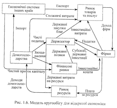 Якщо Е > Z, NE > 0 — відтік капіталу — економічна система дає позики іноземцям чи купує іноземні фінансові та реальні активи. Сукупність основних макроекономічних взаємозв'язків можна представити у вигляді схеми (див. рис. 1.4).
