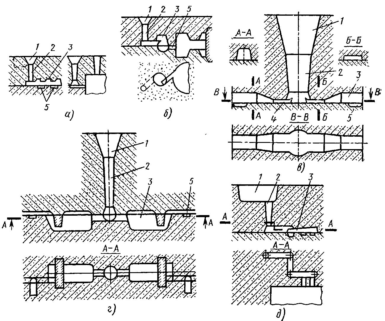 Рис. 118. Тормозящие литниковые системы с установкой: а—гребенчатого шлакоуловителя; б—центробежного шлакоуловителя; в—дросселя; г—трапециевидного шлакоуловителя (принудительное заполнение); д—коленчатого шлакоуловителя; 1—воронка; 2—стояк; 3—шлакоуловитель; 4—дроссель; 5—питатели |