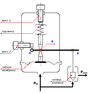 С увеличением входного давления гибкая мембрана (см. Error: Reference source not found) прогибается и точка Б рычага ОА, преодолевая силу упругости сжатой пружины, перемещается верх. Точка А, вращаясь относительно центра О, открывает клапан.