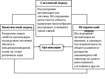 Метод теории организации – это набор теоретико-познавательных и логических принципов, категорий, а также научного (формально-логического, математического, статистического, собственно организационного) инструментария для исследования организационных отношений. Метод организационной науки не описывает сам объект и предмет исследования, но представляет средства и процедуры для получения истинных знаний о предмете. В настоящее время многие научные направления используют процедуры исследования, которые порождены, прежде всего, комплексным, историческим и системным подходами. Особое значение эти подходы имеют в теории организации, т.к. организационные процессы и явления носят всеприродный характер, находятся в постоянном развитии, основанном на изменении их внутреннего устройства и связи с внешней средой.