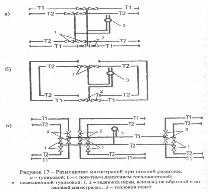 B зависимости от места прокладки магистралей различают системы c верхней разводкой, когда подающая магистраль T1 расположена выше отопительных приборов; c нижней разводкой, когда падающая Т1 и обратная T2 магистрали расположены ниже приборов. При водяном отоплении бывают еще системы c "опрокинутой" циркуляцией воды, когда подающая магистраль Т1 находится ниже, a обратная T2 —,выше приборов.