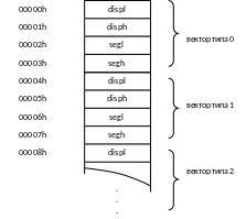 Здесь displ и disph – соответственно младший и старший байт смещения, а segl и segh – младший и старший байт сегмента. Из рис.20 видно, что для определения адреса вектора достаточно взять тип и умножить его на 4. Именно так и вычисляет адрес вектора МП.