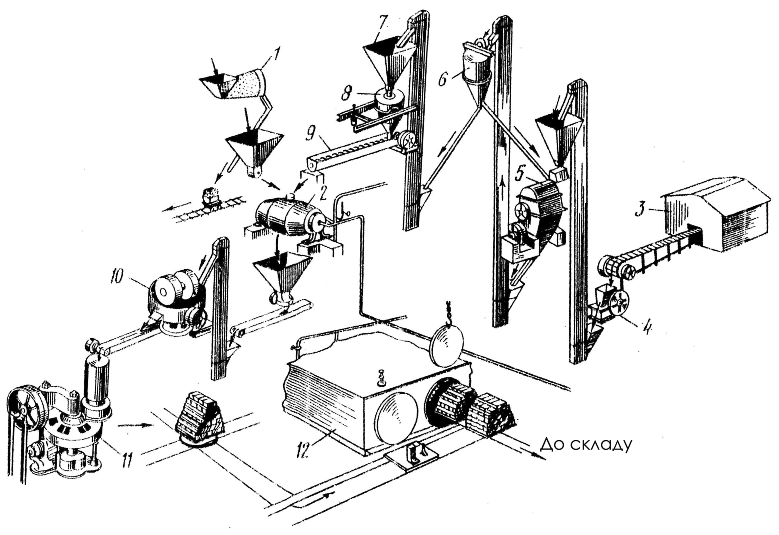 1.Склад песка. 2.Ленточный транспортер. 3.Барабанный грохот. 4.Склад извести. 5.Дробилка. 6.Ковшовый элеватор. 7.Бункер-накопитель. 8.Мельница. 9.Сепаратор. 10.Весы. 11.Шнек. 12.Гасильный барабан. 13.Смеситель. 14.Механический пресс. 15.Тележка с кирпичом-сырцом. 16.Автоклав. 17.Тележка с отвердевшим кирпичом. 18.Дозатор песка. 19.Нож.
